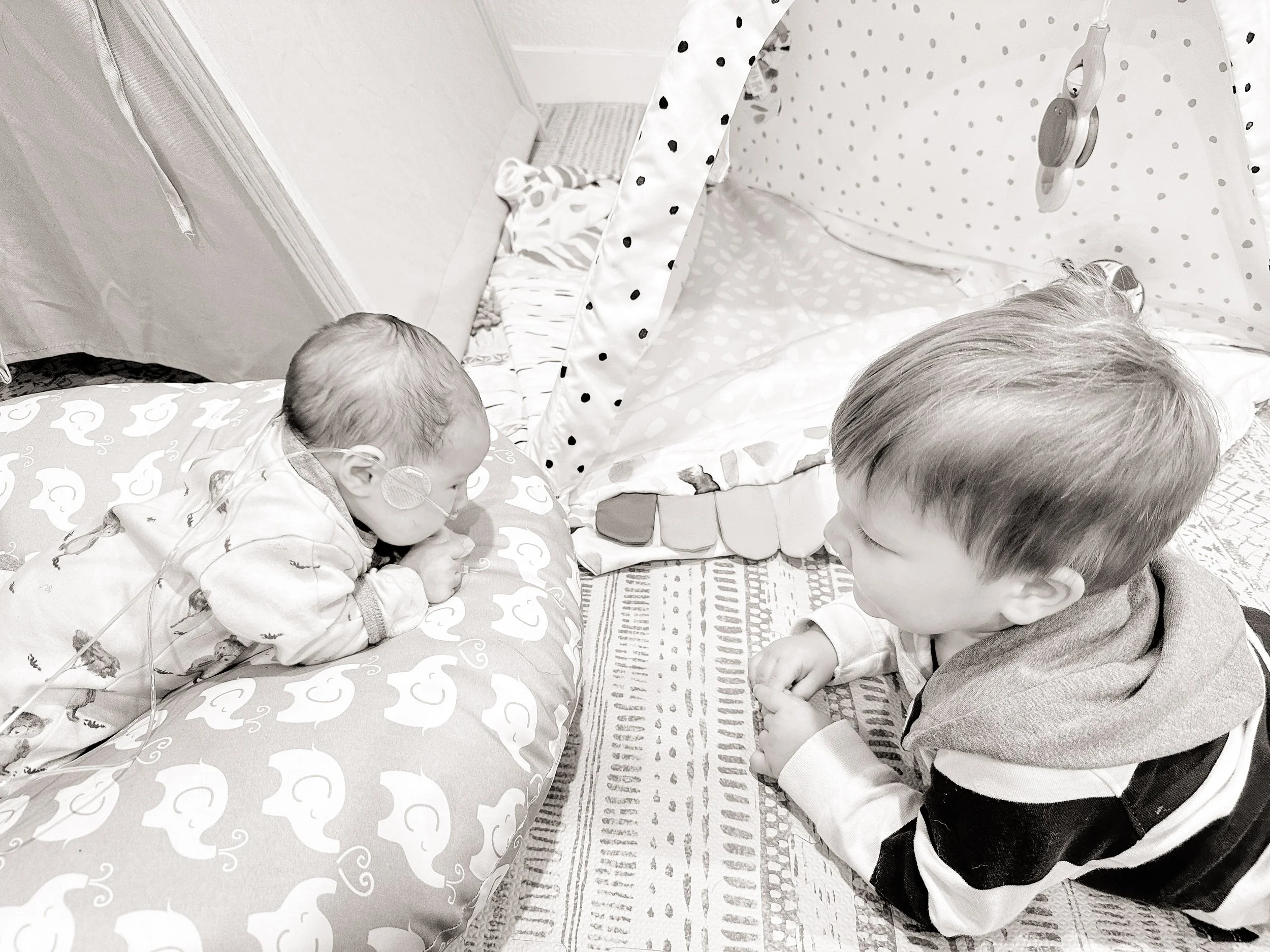 Incorporate black and white toys, mirrors, or teethers to encourage lifting and reaching.